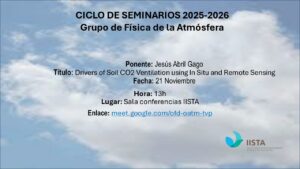 Ponente: Jesús Abril Título: Drivers of Soil CO2 Ventilation using In Situ and Remote Sensing Fecha: 21 Noviembre Hora: 13h Lugar: Sala conferencias IISTA Enlace: meet.google.com/ofd-oatm-tvp ¡Comparte este post!